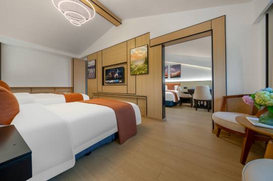 性价比不错,很方便 去景区有车接送。升级个亲子房,很大干净,临山,景色也不错,房间还送小礼品。有一次性浴巾。不错。