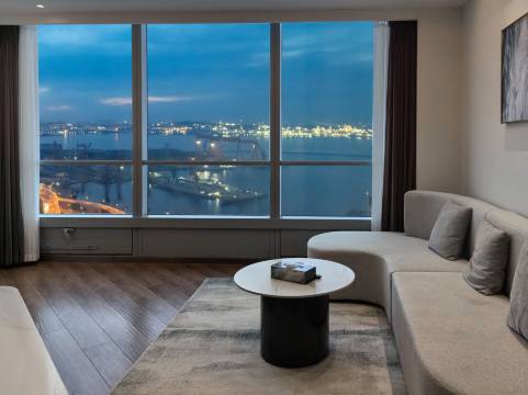 我订的海景双床房,推开门瞬间被惊艳!全景落地窗直面大海,海天一色的美景毫无遮挡,清晨被海浪声和朝阳唤醒,看阳光洒在海面波光粼粼;傍晚看落日把天空和大海染成橘红色;夜晚俯瞰大连港璀璨夜景,躺在床上就能坐拥绝美风光。房间宽敞明亮,装修简约高级,床品柔软亲肤,像陷进云朵里,一夜好眠到天亮。卫浴干湿分离,水压力足、水温稳定,配备高品质洗护用品和大马力吹风机,细节超贴心。高速Wi-Fi、巨幕投影等设施齐全,不管是休闲还是办公都超舒适。卫生更是无可挑剔,房间一尘不染,角落都干干净净,隔音效果也很棒,完全不受外界打扰。酒店还有免费停车场,自驾超方便。从入住到退房,服务始终在线,有求必应,贴心又周到。这次入住体验满分,硬件、景观、服务都无可挑剔,性价比超高!下次来大连,还会毫不犹豫选这里,也强烈推荐给所有来大连看海的朋友,绝对不会失望!
