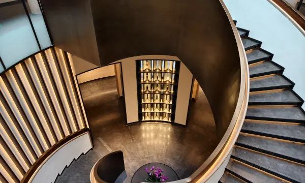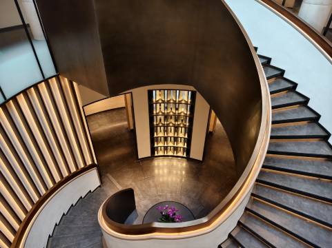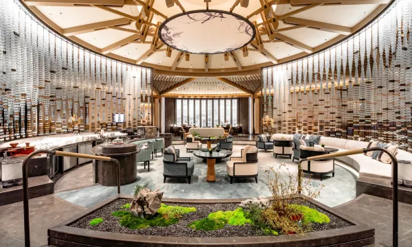 设计融入了大量的苏州本地元素,仿佛一座巨大的苏州园林,而众多的水系元素又与阳澄湖的自然风光相协调。酒店大堂与大堂吧融为一体,空间开阔通透,映入眼前的帘幕是由苏州著名的御窑金砖和玻璃砖拼接而成。空间宽敞,充满了中式情调,整体呈现出简洁大气又不失典雅的特质。房间设计在运用传统建筑文化元素时,精妙入微,在我看来分寸把握的恰到好处;中餐厅的设计也是比较有特色,旋转楼梯的视觉冲击力十足。