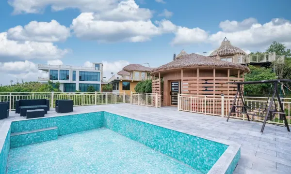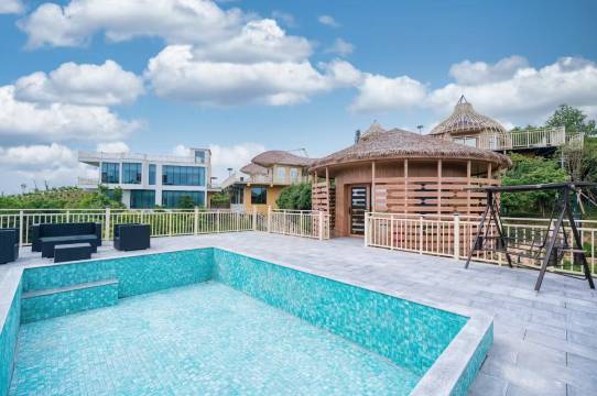 新开的度假酒店,环境优美,设施都很新、很干净!有自己的停车场!在整个住店期间,感受到了热情的服务,感谢熊经理为我们免费升级小木屋房型,有一张大床和阁楼上的小帐篷,两大两小睡的很宽敞舒适!感谢前台小哥帮我们把行李搬到房间,也感谢阿姨帮我们增添一床被子!酒店无边泳池是一个亮点,炎热的夏季,小朋友们在里面玩得很开心!餐厅在入口处,好吃不贵,感谢小哥为我们把晚餐送到房间!需要注意的是酒店周边暂时没有配套,吃饭购物需提前准备,有些小细节需慢慢完善!总体来说,周末微度假又是一个不错的新选择!