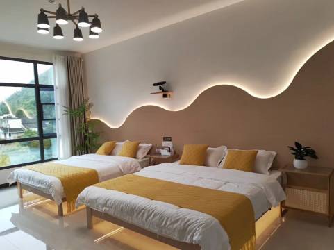 住这里是为了第二天去牯牛降风景区玩,我们是自驾游,民宿离景区驾车3分钟路程。入住当晚七点半到的,看评论区说是老板娘烧菜很好吃,电话联系后提前点的家常菜,有一说一,这是此次安徽行三天以来吃到的口味最好的饭菜,给老板一个赞👍我们一行5人,住的是一间亲子间➕一件双床房,亲子间给100分,房间面积很大很清爽,灯光明亮,装修的很温馨,一张1.8m一张1.5m的床,浴巾洗脸巾都是一次性的,很卫生,投影仪也很棒,躺椅小孩子也很喜欢,提几个小建议,因为有很多是一次性的用具所以厕所里的垃圾桶可以准备大一些,不然很容易满,一次性牙膏可以换成容量更大一些的产品,有一点点不够用。双床房是朋友睡的,价格非常便宜,但是有一说一只能是凑合一晚,因为有对比哈哈哈