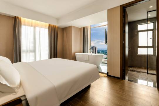 低调轻奢、清新典雅的酒店大堂位于一楼,优雅的云品餐厅为您提供中西式的早餐品种,满足您不同的需求。酒店共一百零四间客房,现代简约复式商务风,精致典雅客房,均以品味奢华的用料以及自然的木饰装点。房间配备智能语音系统随处可见的时尚科技感,所有客房均有视野开阔的全落地玻璃窗,可将城市景色尽收眼底。复式商务的设计风格拥有独立的会客区,让您的差旅生活增加隐私空间。