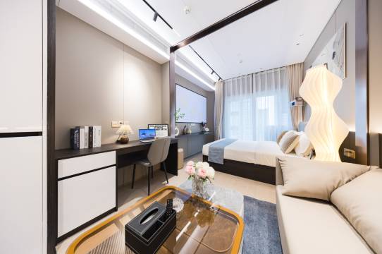 酒店式公寓,前台帅哥还有美女服务非常热情,在房间有不懂的随时联系他们也会及时回复以及处理,环境很好,酒店位置便利,房间干净整洁,床品舒适[玫瑰]