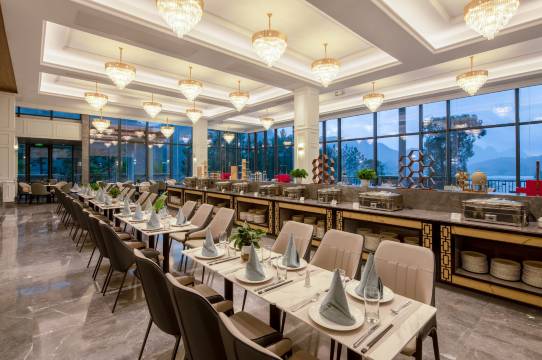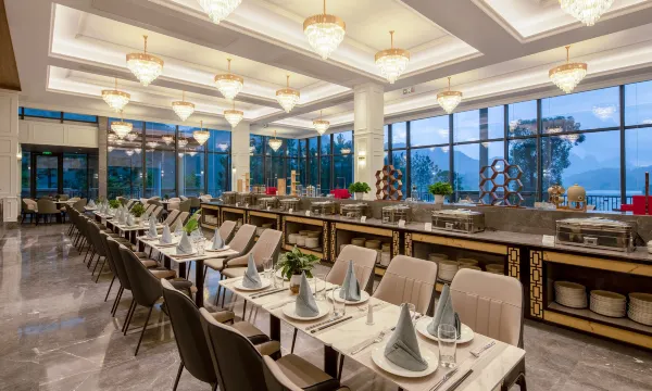 酒店依山傍水,坐落在仙湖旁,周围景色优美,绿山环绕,空气清新,非常适合休闲度假。