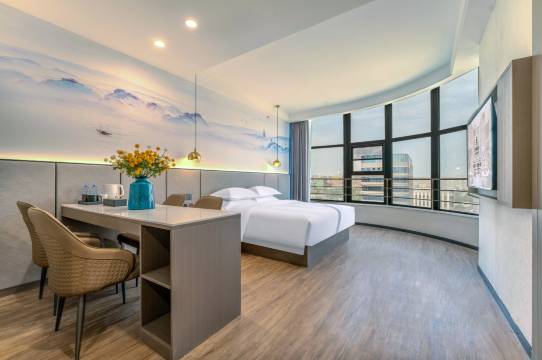 酒店入住感不错,设施设备也很齐全,点的外卖都是机器人递送到房间。酒店旁边就是购交大城市学院,服务员个个都很热情,前台小姐姐服务周到还给我们指引了附近的夜市。真的很贴心。早上退房前台美女送了两瓶免费矿泉水。酒店服务非常贴心用心,房间布置温馨,睡觉很舒服,卫生间一次性用品都是消毒后独立包装,订的是豪华大床房,面积也很大,休息很安静。总之,卫生无可挑剔真得很干净,我连携带的一次性床被都没用上,服务随叫随到!退房还可以寄存行李,赞!环境分给到5分!装修非常有品味,前台给我们安排的房间的朝向很好,阳光充斥,中午的时候还可以晒晒太阳,感觉很治愈。楼层高夜景也无敌!在这家酒店,感受到了优质服务与舒适环境的完美结合,酒店十楼就有免费洗衣房!超级方便!停车场🅿️也好大,整个园区都能免费停车,超级奈斯!真心推荐给来大家。