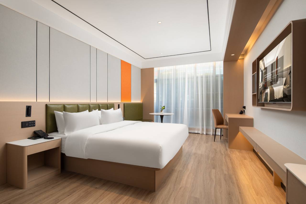 同事介绍来的,房间挺干净的,采光很好,前台服务也很棒,晚上还有夜宵吃,酒店是智能的,小度控制的,不用起床关灯拉窗帘,很棒!早餐也挺丰富,门口还有一个大的停车场,方便停车。出差首选。