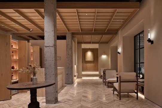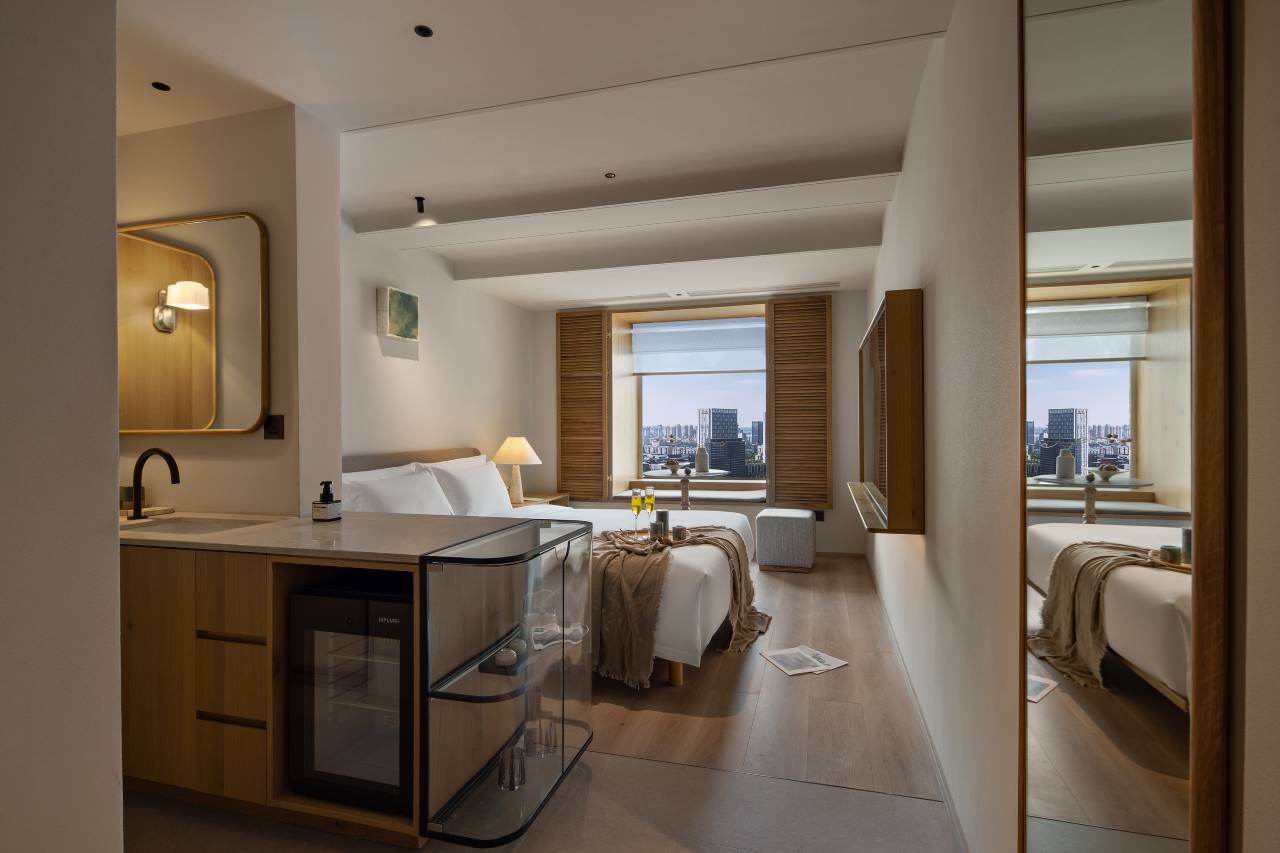 心之所安,梦之所向。我们酒店坐落于杭州繁华市区的一家网红酒店。该处基地本为老杭州城的闹市,我们希望在此处植入一座新与旧融合的“城市民宿”,作为承载杭州城市记忆的精神载体。 建筑与周边环境的关系,是本酒店的主要叙事,酒店整体是在一座充满年代感的老建筑基础之上进行改造的,在对原建筑外立面进行大面积保留的同时,我们分别在一层室外与三层屋面植入了庭院功能,并打破传统,将咖啡融入到大堂吧中,来此的人们,手捧一杯咖啡,或在沙发阅读,或在吧台冥想,亦或在庭院三五闲谈,独享惬意自在。客房延续了公区朴素慵懒的调性,闹中取静。窗外闹市,窗内宁静,一夜安愉后,清晨的阳光透过窗洒入室内,手捧一杯清茶,感受窗外老城岁月变换的痕迹。餐厅设置在二层,我们在保留原有框架的同时也重塑了空间关系,以大面积大地色系的天然石皮作为基调,内敛而包容,在此处卸下疲惫,静享早点,将多元的生活样式简单化。 心安即是归处,在杭州城的声色光影中,亘古至今相同的故事依然在这座城市上演。