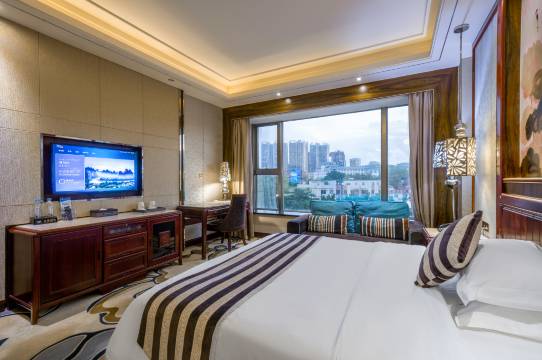 酒店位于新兴二路130号大正峰景园,尽占地利之便捷,周边商业配套完善,楼下即是沃尔玛大型百货超市,紧邻两广市场和长洲区政府办公大楼,周边分布各大银行网点,交通便捷,距金晖汽车站仅需5分钟车程,距火车站10分钟车程,距高铁站25分钟车程,酒店距机场20分钟车程,让客户独享购物、餐饮、娱乐、休闲和商务之便利。酒店共有百余套个性、创意、豪华兼具的客房,多款经典房型可以满足客户多元化需求。客房多媒体方面,采用了新的智能高科技多媒体产品,wifi无线宽带设施、电子钟、收音机、音响播放、多媒体转换众多功能于一体,客房配备全自动干衣机、高清数字液晶电视、液晶电脑高速宽带接入。拥有酒店设有多功能会议厅,会议室配备高清多媒体投影等先进设备,可为商务会议活动提供打印、传真、宽带上网等便捷服务,以满足各种类型的会务活动。酒店力求在设计、施工、技术和细节上做到优质,设计以欧式与现代时尚中式两种风格并存。酒店所用的装饰石材均为珍品级的天然大理石和花岗岩,低调奢华的美感给人带来视觉震撼。在软件方面,酒店依托智能客房操控系统,为客人提供宾至如归的信息化、智能化、个性化服务,酒店身份识别系统对客人的服务与管理可以做到更人性化、更个性化;酒店采用了行业先进的智能化中央空调和新风系统,为客人营造更具人性关怀的商务空间,创造一个舒适、温馨的住宿环境;通过智能化退房功能,把客人结帐的时间减至短;灯光感应系统,灯光场景功能提供给客人宾至如归的温馨;智能电动窗帘,让客人尊享现代电动化的便捷,更彰显服务细节的人性化,为客户营造一个舒适的商旅生活空间,进一步提高客人的满意度。酒店一贯秉承“要做就做优秀”、“满足客户需求,超越客户期待”的理念,把为提供完善、优质的服务,始终作为酒店追求的一项重要目标,您的开心与快乐,就是酒店的满足与追求。