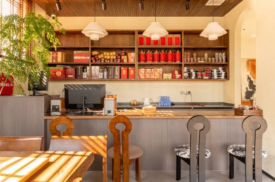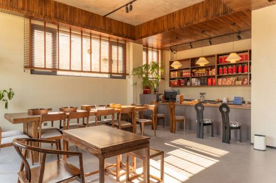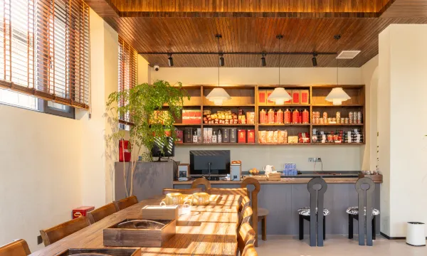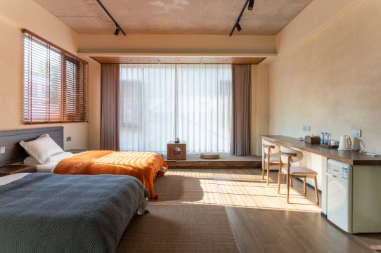 民宿外观采用复古与现代相结合的设计手法,斜坡顶设计,红泥青瓦古老工艺,打造上房揭瓦的网红打卡地,暖色外墙配置大面积落地窗.前有花草小院,内有手工石头文化墙和图书阅览休闲区,配有共享厨房餐厅,客房由挂毯油画点缀,让您在安静诗意的环境中尽享山居之旅.