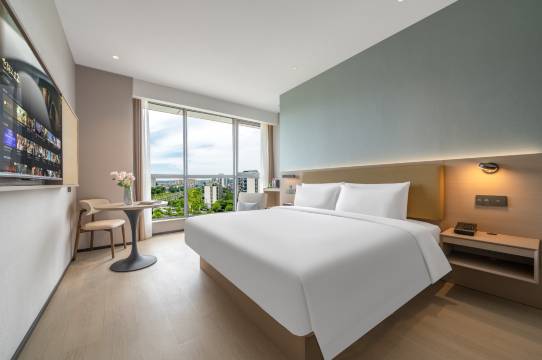 酒店周边: 酒店位于杭州上城区九堡丰收湖时代中心一期2幢。附近有四季青服装大市场、九天环北服装城、意法轻纺城、杭州客运中心、杭州城东医院,地理位置方便优越。 交通便利: 距离杭州国际服装城步行11分钟,杭州客运中心开车8分钟。靠近地铁1号线,可直达西湖景区、杭州东站、杭州城站、萧山机场等。靠近德胜高架路,可直达市中心、下沙大学城。 设施服务: 酒店拥有停车场,WIFI,酒店光速入住、极速退房、预约发票,方便快捷是您出行的选择。 特色亮点: 酒店客房位于 7 楼,落地窗视野开阔、俯瞰空中花园。客房由名师设计,采用简约实用型风格,搭配人体睡眠工程学定制的喆遇大床,给您静谧舒适的睡眠体验。