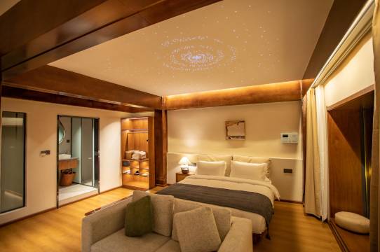 房间大小:装修是有点古中风的,房间很大很宽敞,设备齐全,24小时地暖,制氧机加湿器壁炉都有,窗帘马桶都是智能的,洗漱用品很不错 都是牌子的,用不完还可以带走,房间的香薰味道也很好闻~