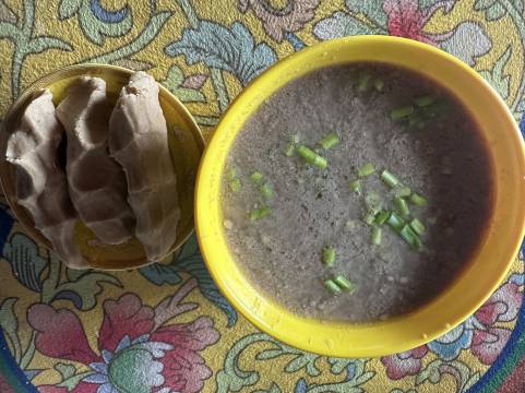 早餐担心我们久等,端出来热腾腾的酥油茶,藏粑教我们怎么吃。五楼的餐厅太有格调了。