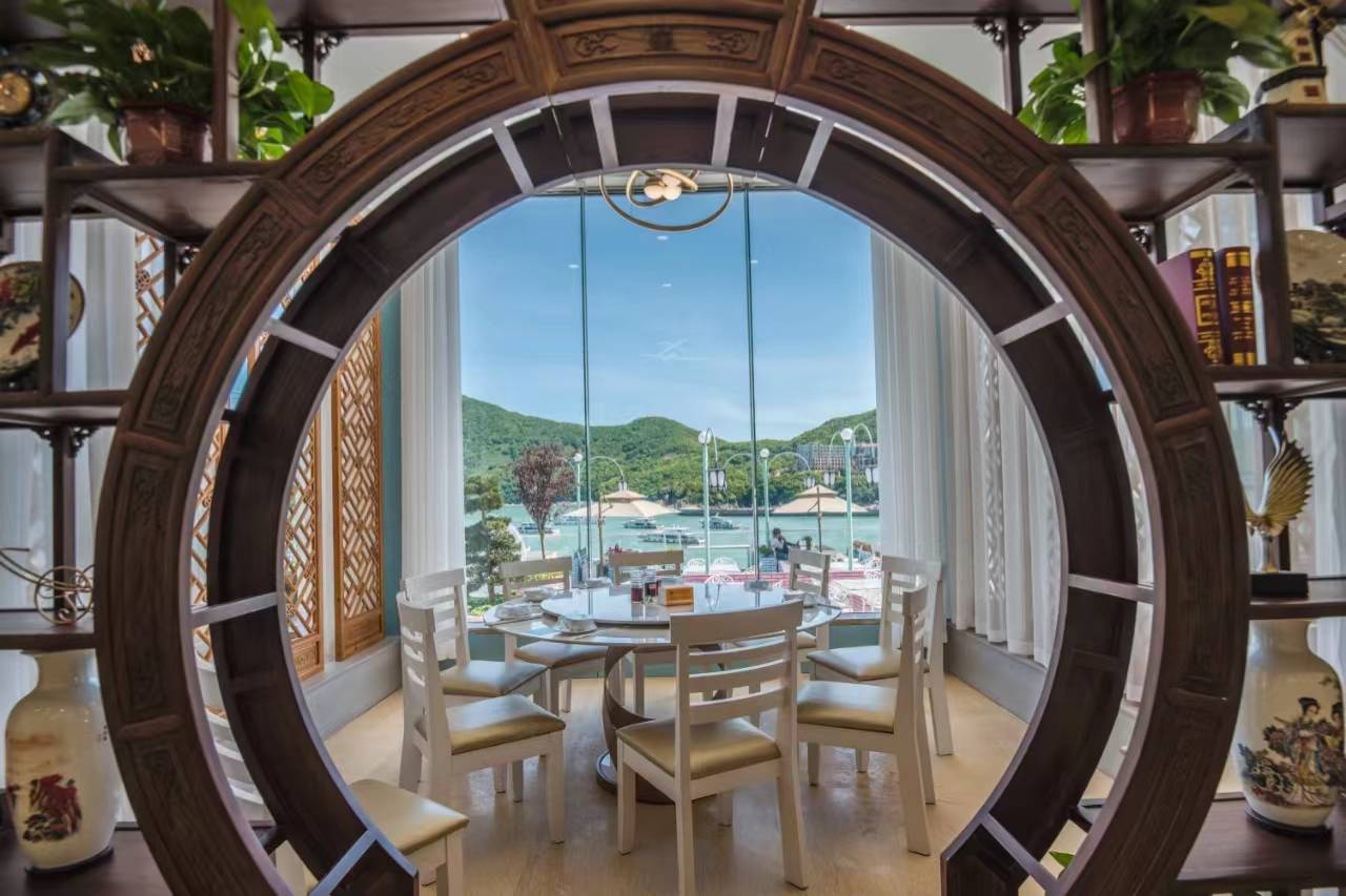 房间的大落地窗是核心亮点,躺在床上就能眺望碧海青山,船只在海面缓缓驶过,傍晚的夕阳把海面染成暖橘色,氛围感不错;大堂的古船装置呼应海岛主题,公共区域通透开阔,随手拍都有海岛度假氛围感