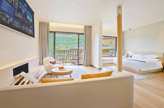 房间很大,设施设备也很好,智能马桶,窗帘,有浴袍,浴缸也很干净,能从窗外看到风景。离郎德苗寨也挺近的10公里,开车20分钟就到了,有芦笙舞表演和篝火晚会;附近住的最舒适的一家民宿了。服务很好,小哥哥小姐姐帮我们拿行李,送到房间。服务很热情。