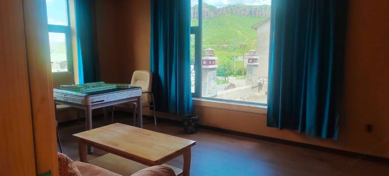 一家来旅游,这个房间很大,炕上既可以打牌,还能睡觉,还有一个小阳台喝喝茶,旁边就可以看到牙齿装的山脉,夕阳时照射的金闪闪的,像一排大金牙。