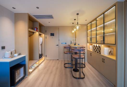 房间比想象中更宽敞,布局合理,视野开阔。床品洁白干净,床垫软硬适中,一夜好眠。卫生间干湿分离,热水充足,提供的洗护用品品质不俗。细节处见真章,小冰箱,保险箱。