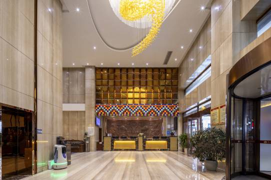 酒店楼下的小吃街从藏式汤锅到川味小吃应有尽有,夜晚灯火通明,烟火气十足。步入酒店大堂,宽敞明亮的空间搭配精致的装潢,瞬间让人感受到高端酒店的格调。并且整个酒店弥漫着淡雅宜人的香氛,这种细节处理让入住体验从一开始就充满愉悦。
