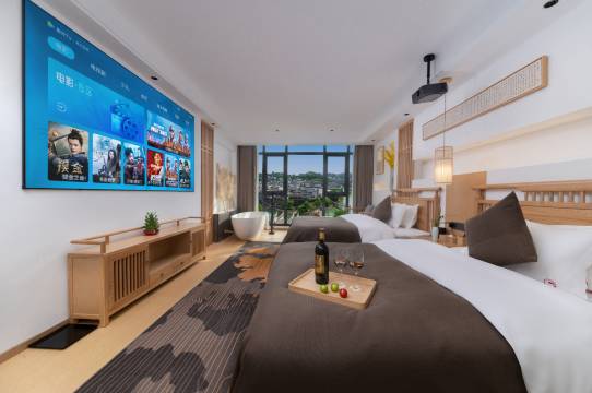 老板非常热情,还安排了车接我们一家人,酒店前面有一个小小的坡,下车老板就过来帮忙提行李了,还帮忙订了演出的票和回程的磁悬浮,磁悬浮的入口就在酒店旁边很方便,就是去景区稍微有点远,要走几百米,但是,远也有远的好处,晚上相对安静更多,前面也有江,水很清澈,大落地窗,房间都是智能的,这点很好,早餐也很不错,还有咖啡,退房的时候我们掉了一个房卡,只收了二十补卡费,希望老板生意兴隆,越来越好!