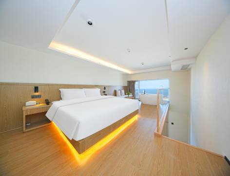 酒店整体采用自然隐逸的原木风格,化繁为简。摒弃了装饰和陈列的堆砌,注重材质与细节,营造丰富的感官体验,为“人的感受”无限留白。 LOFT户型结合全景观海落地窗,宽敞的空间成为链接“自我”与“自然”的载体。在这里,住客可以卸下负担,放慢脚步。以人为界,向内静思,向外探寻。