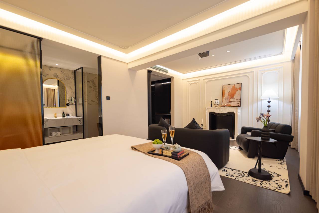 酒店客房内设有全屋智能系统,小度音箱、声控窗帘和智能电视,让您轻松掌控房间氛围。观影房型的巨幕投影系统提供身临其境的视听享受,智能马桶和超大化妆镜则尽享满分细节,为您带来舒适便利的居住体验。