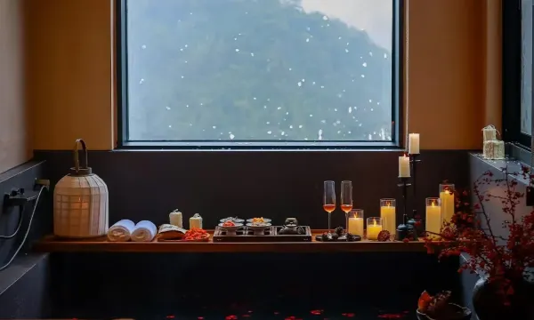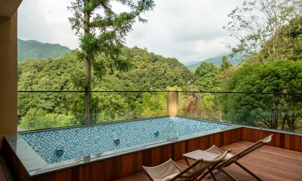 酒店房间伴山而建,私密性很好。房间望出去远处的山谷很美,房间里的汤池配上窗外景色超级出片!