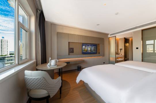 酒店是连锁酒店,2024年新开的酒店。位置非常的好,旁边就是茂业天地,里面各种吃的,非常的方便,整体装修比较新,窗外就能看到秦皇之眼摩天轮,服务也很好。