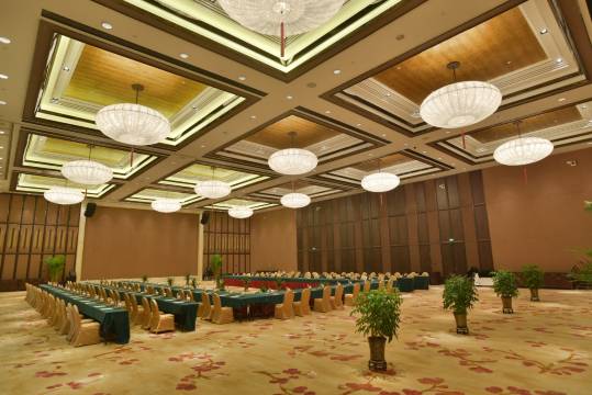 山庄附设多个风格迥异的会议厅,可同时容纳1500余位宾客,适于举办各类商务会议与宴会;其中特大宴会厅可容纳600余人同时就餐,是举办大型宴会的理想场所。山庄临湖设有大型婚庆广场,另配备10余个豪华独立观景包厢,宾客可坐拥山湖美景,尽享口福之乐。