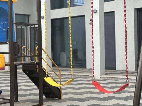 设施:有蹦床,有小孩的滑梯,秋千,可以满足小朋友了。