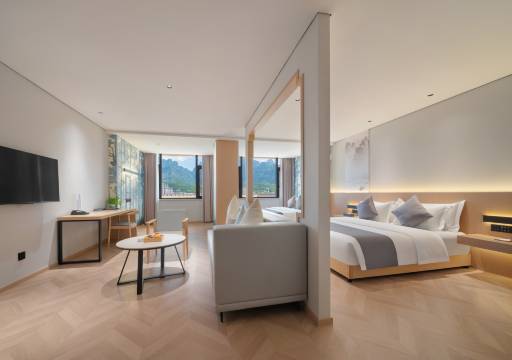 提前在携程上订了天见,入住后感觉很好。首先硬件上,装修虽不豪华,但是新,整体风格素雅,酒店位置极佳,房间干净整洁,宽敞明亮,床很大,还配了长椅,小冰箱。酒店有天幕,正对天门山,还有小孩子玩的区域酒店的服务可圈可点:1、提前一天酒店工作人员打来电话确认行程并且主动升级房型,这个连后来的五星酒店也没有做到位。2、当天到店时高经理特意下来迎接并帮忙拿行李。3、入住手续快速同时让其他家人在大厅长椅上休息并送上开水。4、一进入客房,空调已经提前工作,这么炎热的夏天,让客人真正享受到了酒店的贴心服务。5、高经理还不厌其烦给我们介绍周边吃饭的地方。7、第二天退房,高经理还来询问我们的入住体验。合着我们一大家子的入住体验,酒店的服务绝对可达满分五分。