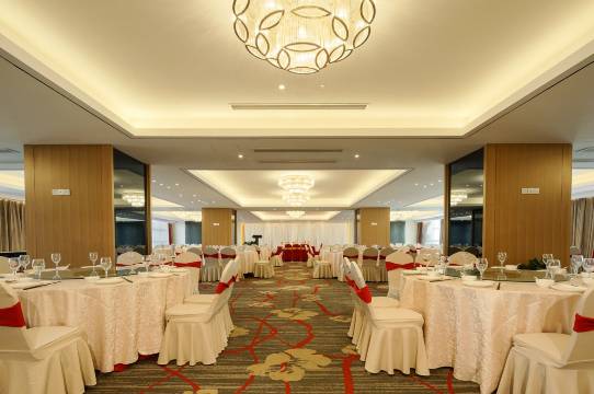 酒店共25层,建筑面积26000平米,拥有600个中西餐位(多媒体宴会厅、包厢等),位于酒店4/5楼,拥有可容纳300人的多功能宴会大厅及8个风格各异的独立包厢。酒店三楼,提供中西式自助早餐,冷餐酒会,散客点菜,小型宴会。