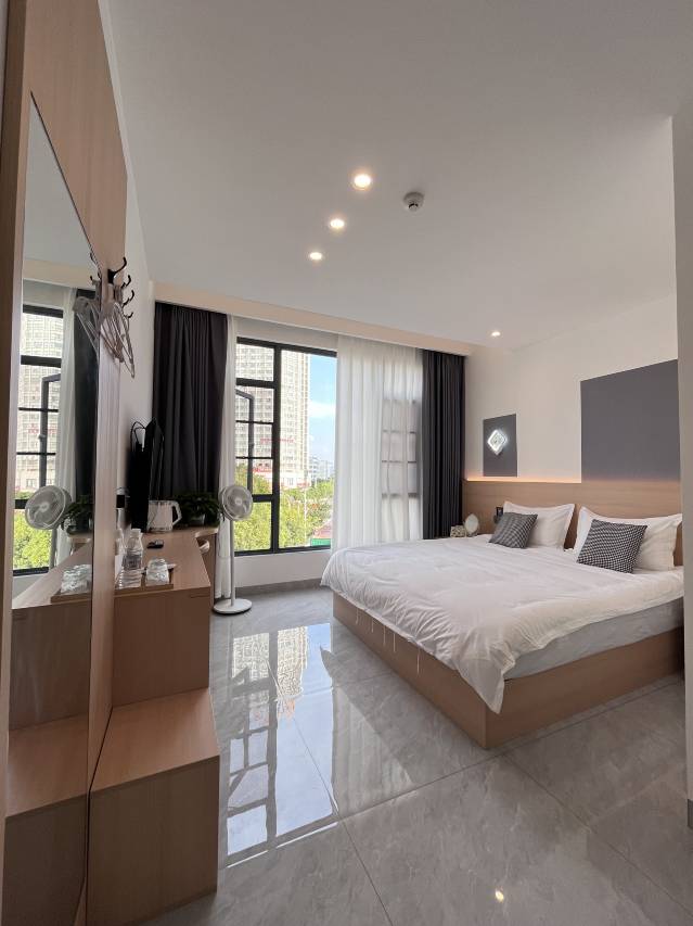 和同事出差,睡眠浅,选择了靠里面的房间,很安静,晚上也不吵。房间也很干净,床上用品也很白净。房间整体的布局很舒服,和图片一样的。吃东西很方便,楼下就是干锅。店家很热情。下次出差还会来的。推荐大家。