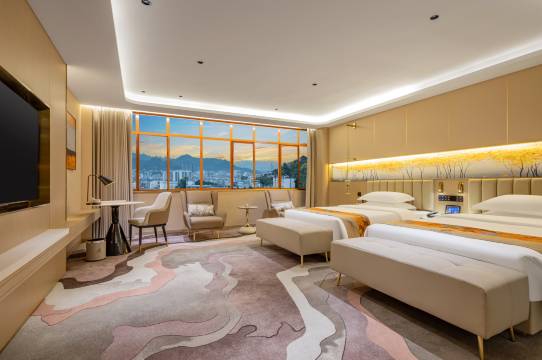 酒店房间明亮干净,三分区卫生间,干湿分离,一体智能化,豪华自助早餐丰富多样,地下停车场宽敞,目测能停下一百多辆,窗外风景好,有山有水,交通便利,大厅服务员工作热情周到,工作细节化,酒店去年才开的,设施很新,体验感很不错
