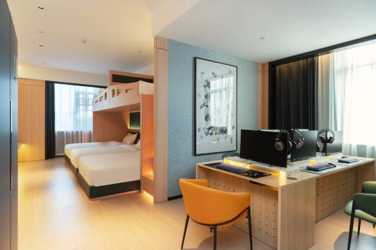 懂你爱玩,找到自己人。我们是一家以文艺时尚、电竞科技为主题的年轻人喜爱的酒店;大厅陈列多种多样的各类书籍、海量娱乐设施一体化,提供休闲娱乐(街机、双柄游戏机、电视等);店内设有平价超市、会议室、自助洗衣等,二十几款桌游如狼人杀、剧本杀、血染钟楼等火热本可玩。