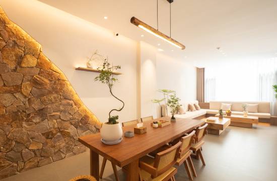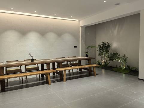 独行至小楼,一处素墙围合的院落静立。推门,时光陡然慢淌——粗砺陶壁晕染暖光,枯山水在脚下铺展,沙砾的波纹凝固成禅意。一束野芒草斜倚素陶瓶,在留白处投下清瘦的影。