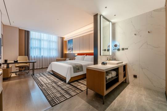 离地铁站和我工作的地方近,出差选择的这家蛮舒适的,环境好,房间布局也挺干净的,空间很大哈,设施这些也蛮全的,还很安静
