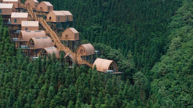 民宿位于广西柳州三江侗族自治县,占地27亩,由18栋独立装配式建筑的豪华客房,5栋配套配套用房和1栋多功能咖啡书屋组成。民宿设计采用时下流行的露营风格为主题,每间客房均有独立露台,并全部配备户外恒温SPA泳池。民宿建筑群成阶梯式排列,错落有致,星罗棋布。除了360度景观的圆形咖啡书屋和网红帐篷火锅包间外,露天电影院和民俗文创集市更为民宿增添了浓郁的文艺气息。入住民宿,不仅能在茶山之巅欣赏群山环绕的自然之美,体验采茶炒茶的工艺之妙,了解少数民族文化的异域风情,还能在享受舒适时尚生活的同时感受野外露营的自在和惬意。