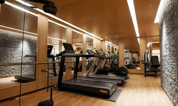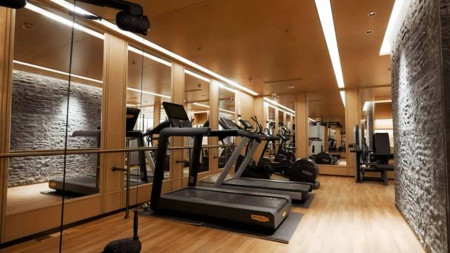 健身房设施基本齐备,口头跑步机在坡度升降时候发出故障声音。