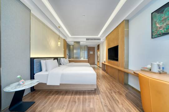 酒店位置离缙云西站10分钟车程。前台小姐姐很热情,安排房间很满意。房间大,干净卫生,电动窗帘,智能马桶,隔音也不错,就算靠着马路边,也不会很吵,房间也备有耳塞。入住后机器人马上送上欢迎水果和小吃。早餐品类丰富,前台还能打包一杯路上喝,太棒了。超赞的酒店。