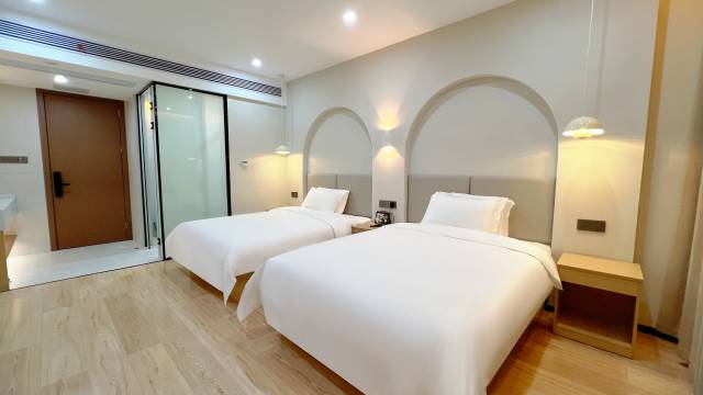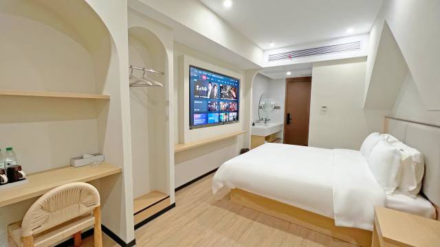 原本订了隔壁的酒店,到了之后看到我们带了宠物,竟然拒绝入住!转头就来到了这家酒店,结果一进去被惊艳到,价格实惠环境还很棒!很时尚新颖的装修风格,还都是智能家居,体验感很棒!关键是对我们的毛孩子很友好!这服务质量值得推荐!忘记拍照了😅