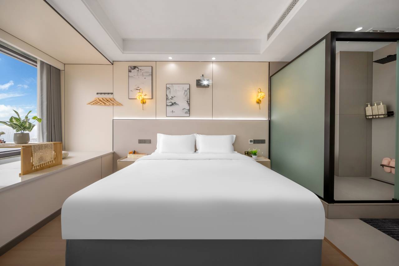 很不错的一家酒店,服务很周到,房门上安装了猫眼,安全方面做的很到位,房间内设施很齐全,卫生很干净,还有智能马桶,环境很安静,一晚上睡的都很舒服,第二天离店服务人员还给我们把行李送到高铁站进站口,真的太贴心了