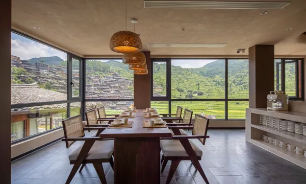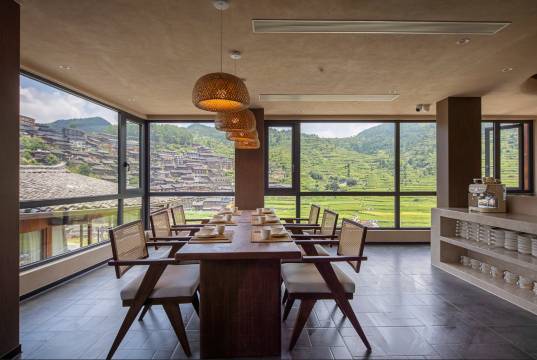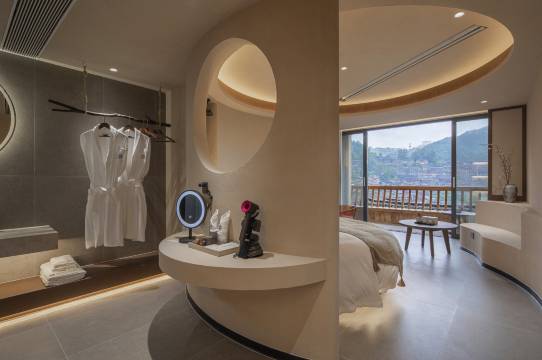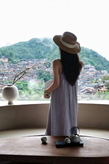 最让我心动的是那超大的落地窗,拉开窗帘,窗外的绝美景色一览无余。能看到错落有致的古老村寨,还有郁郁葱葱的青山,仿佛一幅展开的山水画卷。清晨被阳光和美景唤醒,这种感觉太美妙了。