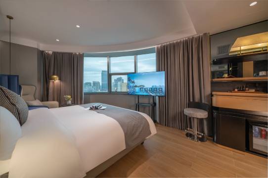 这次外地朋友来南宁,就在朝阳广场附近找,选了这家酒店,呀,竟然是家宝藏酒店,位置没得说,站在窗口,朝阳广场360℃一览如云。刷个小黄车,溜达到三街两巷也很近,想吃什么竟有尽有。这次特意定了浴缸房,好好泡个澡,一天的疲惫荡然无存。房间我太爱了,床很柔软,看了才发现他们家用金可儿的床垫呢,冰箱的饮料也是免费喝。不得不说这家店太豪爽了,平时都自己备洗漱包,这次太急没有拿,抱着试试的态度,又是惊喜,我喜欢用的款式,完全符合我的牙。还有还有,智能马桶,对我们女士太友好了,暖暖的,好舒服,前台的小姐姐服务也非常好,非常贴心的介绍房间设备使用,旋转的吧台,满足我吃外卖的各种……太推荐他们家了,以后就住他们家了
