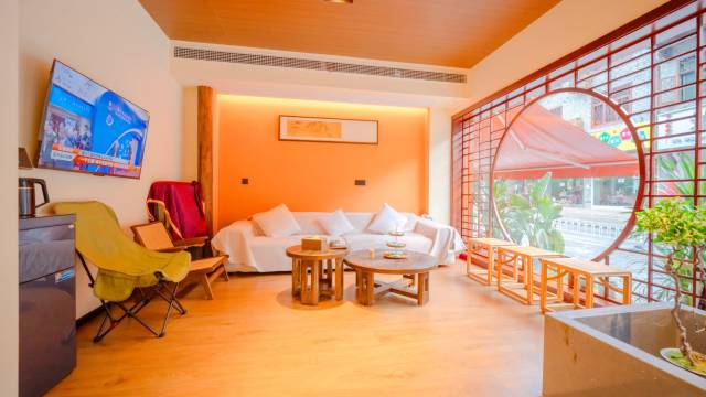 民宿坐落于风景如画的边城茶峒古镇内,是一处远离尘嚣、充满文学气息的静谧之地。这里山清水秀,绿树成荫,河流穿镇而过,为古镇增添了几分灵动与活力。民宿紧邻清水江,这条江不仅是边城的灵魂所在,更见证了沈从文笔下翠翠和傩送之间动人的爱情故事。蓦然民宿的建筑外观保留了古镇的传统风格,古色古香的吊脚楼、石板路、青石板街等元素共同营造出一种穿越时空的古老氛围。民宿内部则融合了传统与现代元素,中式家具、装饰品和摆设彰显出独特的魅力,同时现代化的生活设施如舒适的床品、现代化的卫浴设施以及便捷的无线网络等一应俱全,确保游客在享受古老风情的同时,也能拥有舒适的住宿体验。民宿房间包括豪华大床房、豪华标准间、豪华双床房以及观景露台大床房四种房型,满足不同群体的出行需求。房间布局合理,既保证了私密性,又提供了充足的公共空间供游客休闲交流。房间面向古朴的青石街道和斑驳的老屋,行走其中仿佛穿越回了沈从文笔下的边城时代。房间内设施简洁大方,整体干净整洁,床单、被套等一客一换,确保游客的住宿体验干净卫生。