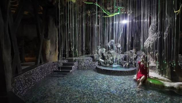 酒店所处又叫西武当太极宫,满满的太极元素,在深山中显得很独特。房间自带泡池,方便泡汤。床品是古式的床架和幔帐,古色古香。