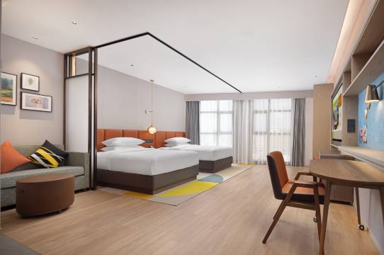 兴义桔山广场希尔顿惠庭酒店坐落于黔、滇、桂三省结合部,有着“康养胜地,人文兴义”之称的兴义,酒店位置处于兴义市桔山街道桔山广场,康居广场酒吧、小吃一条街核心商圈,紧邻世界地质 公园万峰林、万峰湖、马岭河峡谷;桔山广场、梦乐城购物中心近在咫尺,距大润发生 活超市步行13分钟,距国际会展中心7分钟车程,距兴义万峰林机场14分钟车程,距万峰林国际会议中心17分钟车程,距兴义火车站31分钟车程,附近公交车站分布较多。酒店客房可以同步有生活吧、沙发床等家庭必备设备,设有绿洲大堂、灵动用餐区、健身房&洗衣区、户外绿洲庭院、高吧座位区&上网打印区、以及24小时开放的心选小铺和自助饮吧、可提供 60-200人中高端会议接待,并配套会议自助餐饮。