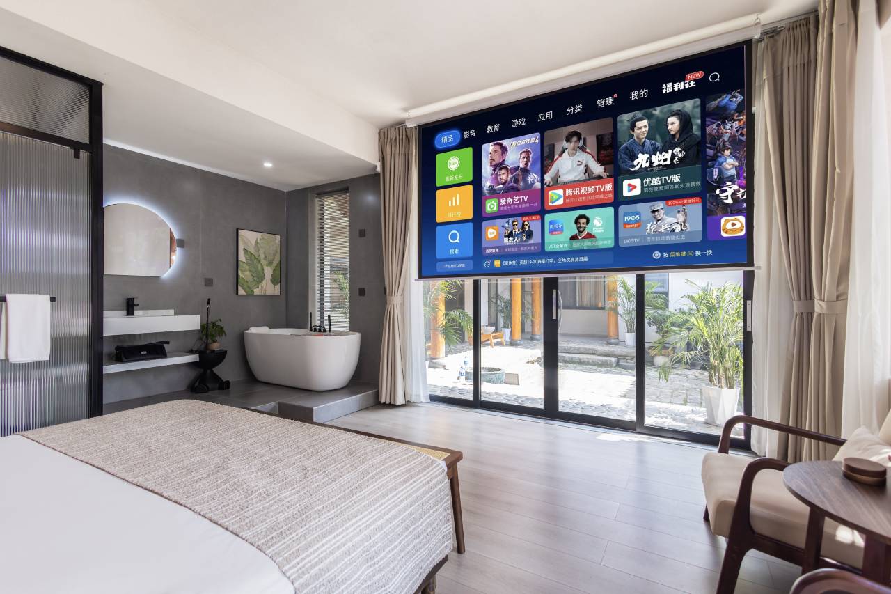 古城里面,打车进不来。还要走十几分钟。有点不方便。但是去古城街还是很近的。投影幕很大看的很舒服。一楼私密性不太好。除非一直关着窗帘。院子不大,有两只狗
