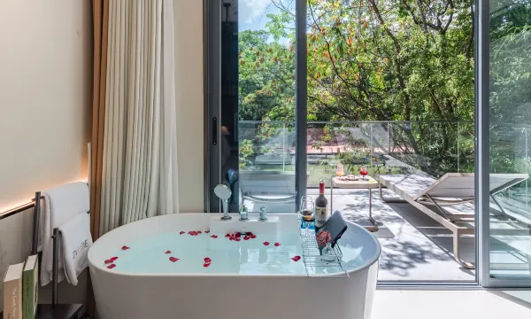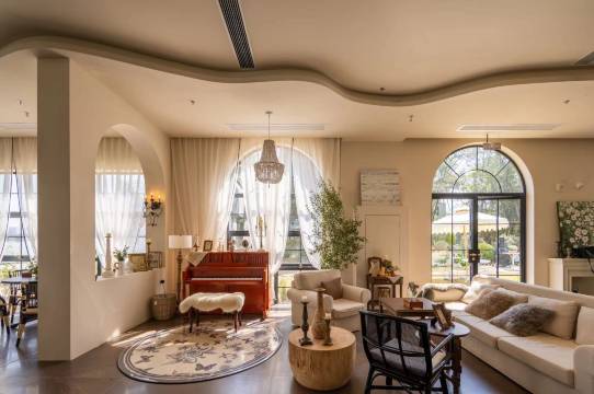 到了景区门口有帅气的小哥哥开着接驳车来接送。景区环境超棒,全部是绿植没有机动车,能看到晨跑和骑车的小伙伴。入住有精美的欢迎水果和下午茶。推开房间的门就能看到配套的餐厅,应该是个网红餐厅,好多漂亮的小姐姐来打卡。