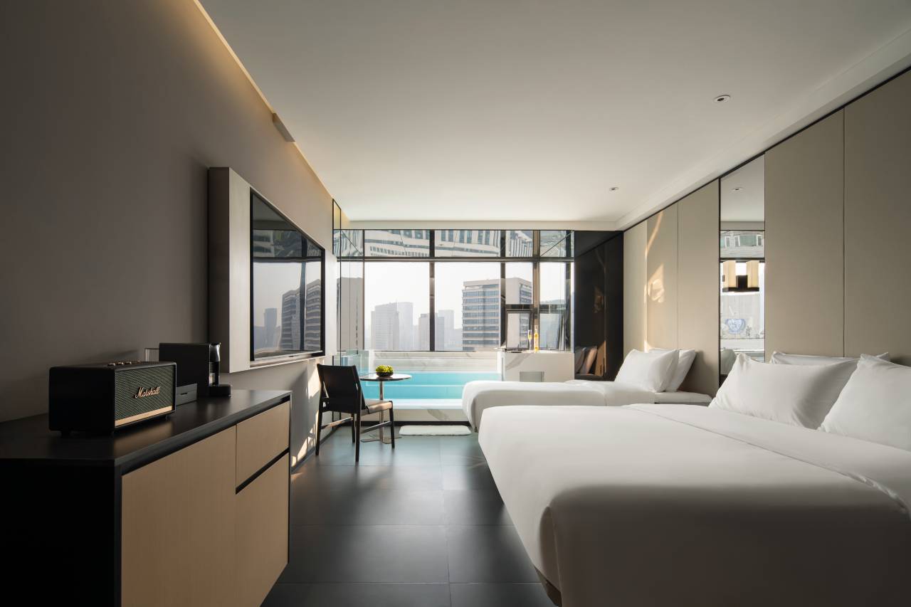 客房里,黑白床品衬着城市夜景,开放式台面上立着Appelles的黑管洗护,Marshall音箱的复古纹路藏着慵懒。拿索尼微单取景,镜头里是玻璃墙的光影、桌上的贴画电脑,连空气里都裹着松弛——是把精致揉进日常的舒服。