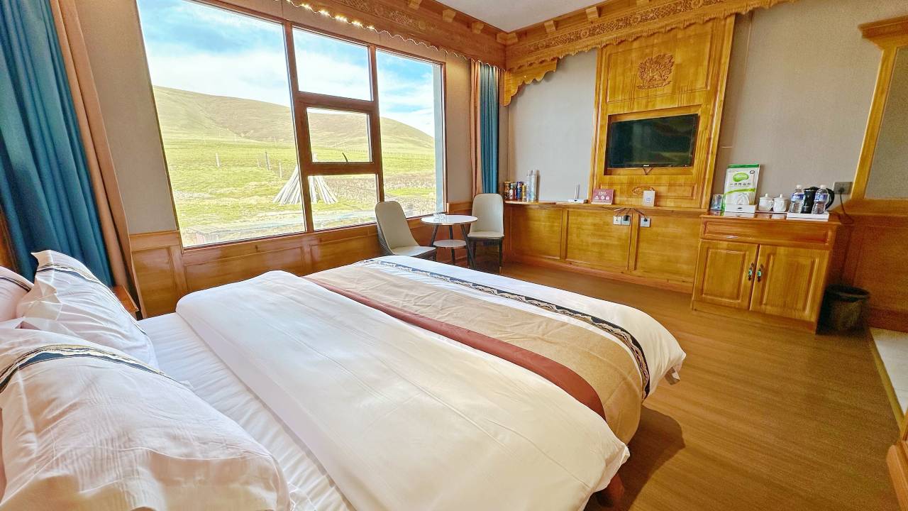 房间藏式碉刻装修,很考究。房间宽敞明亮,干净卫生。酒店离观景台近,步行15分钟即可到达。是住亚青寺不错的选择。