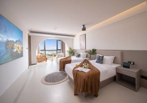 房间宽敞舒适。装修风格地中海现代简约风,很有特色,房间非常大。